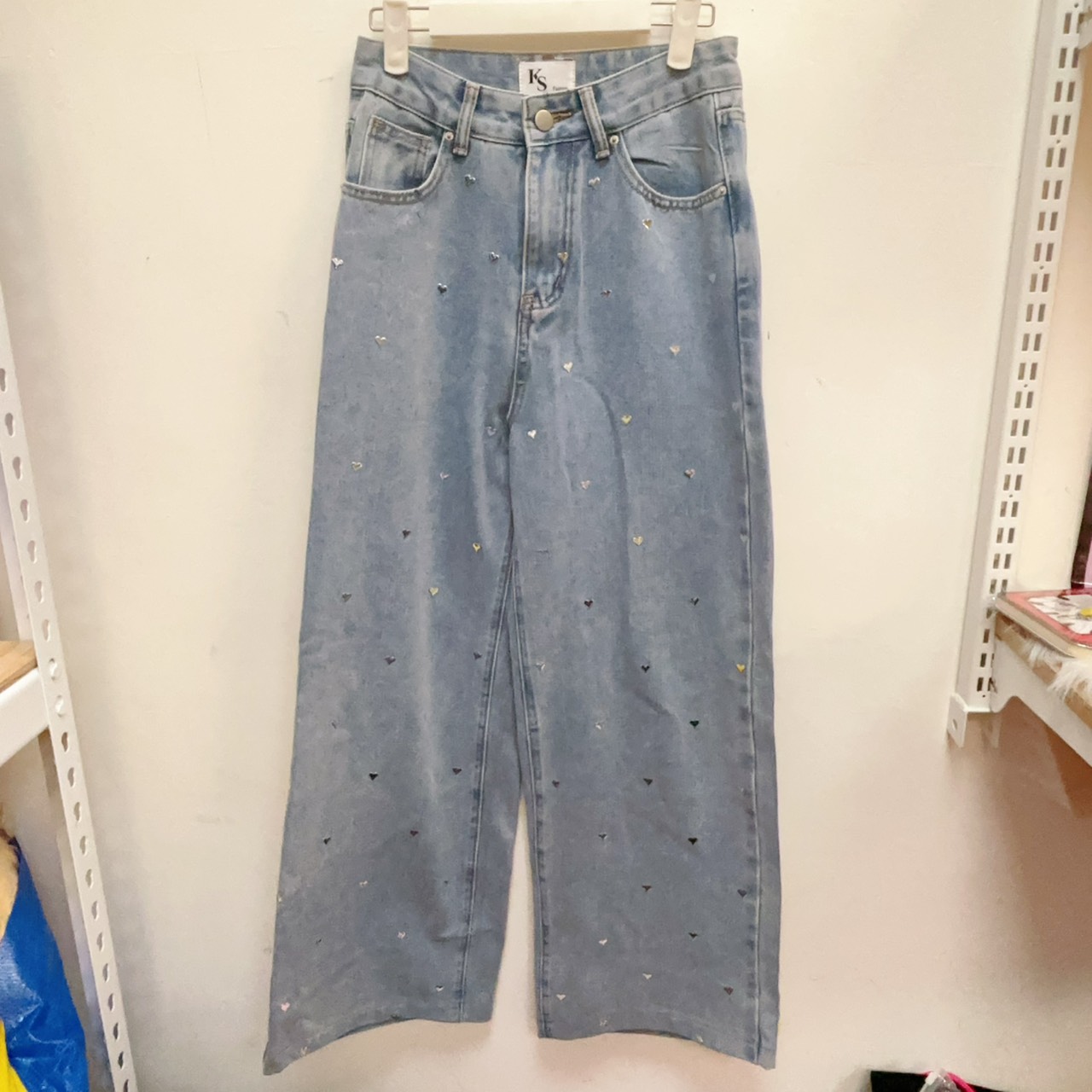 立體燙鑽愛心牛仔寬褲S號
