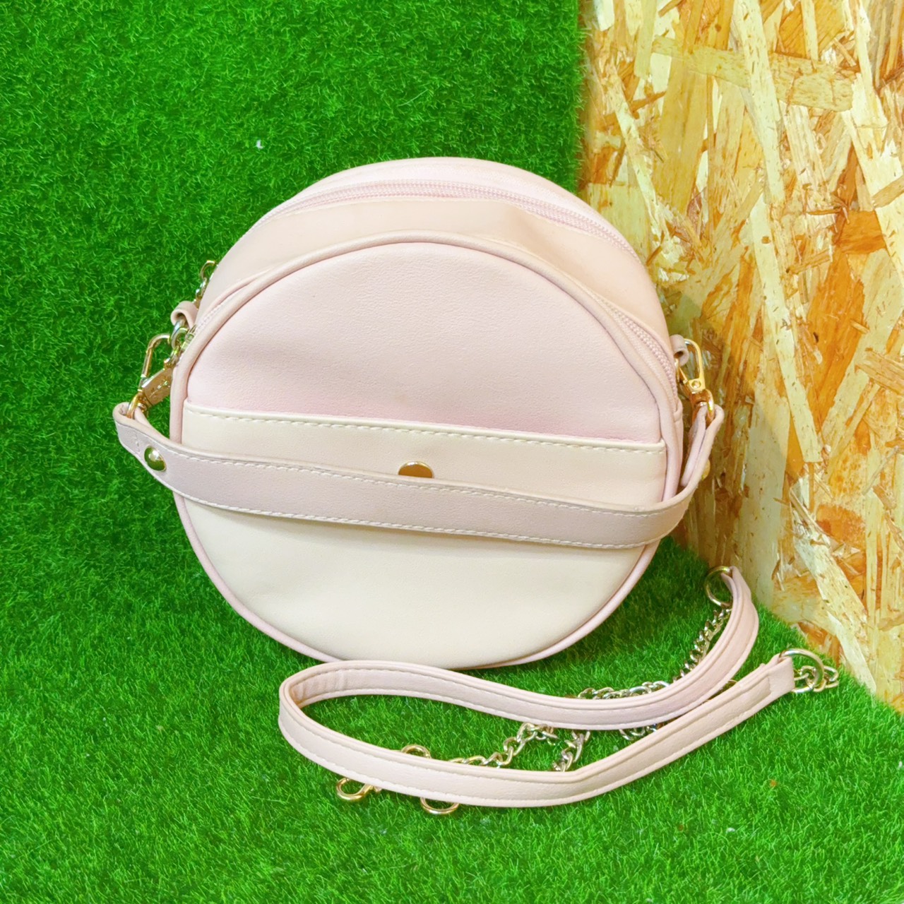 福利品-粉色皮革圓形斜背包